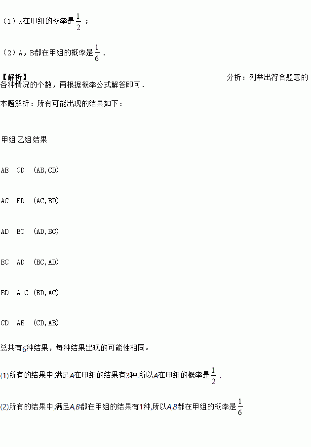 将A,B,C,D四人随机分成甲、乙两组参加羽毛球比赛,每组两人。