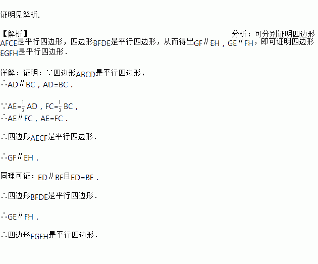 如图,ABCD中E,F分别是AD,BC中点,AF与BE交于点G,CE和DF交于点H,求证:四边形EGFH是平行四边形.![]()