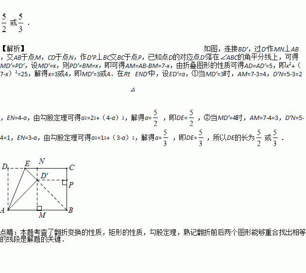 如图矩形ABCD中,AD=5,AB=7,点E为DC上一个动点,把△ADE沿AE折叠,当点D的对应点D′落在∠ABC的角平分线上时,DE的长为__.