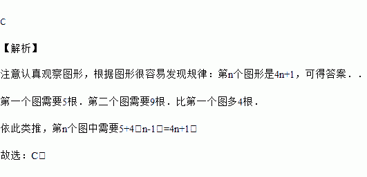 下列是由一些火柴搭成的图案,图①用了5根火柴,图②用了9根火柴,图③用了13根火柴,按照这种方式摆下去,摆第n个图案用了多少根火柴( )