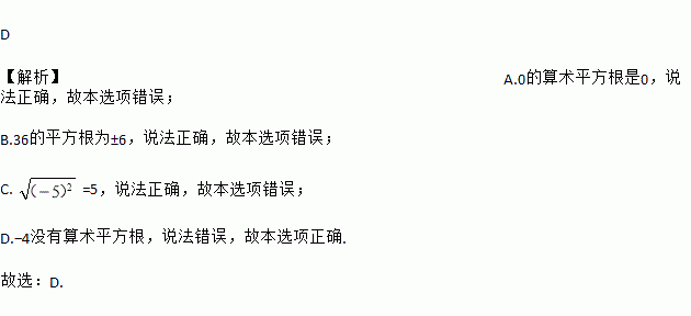 A. 0的算术平方根是0 B. 36的平方根为±6 C. =5 D. -4的算术平方根是-2