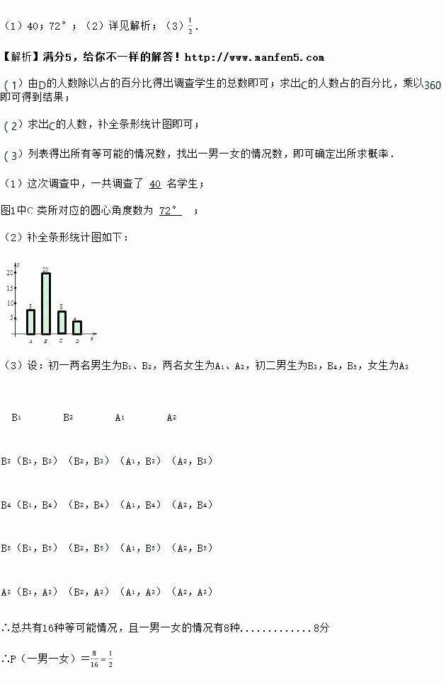 (3)为了让全校师生都能更好地关注“校园安全”,学生会准备组织一次宣讲活动,由问卷调查中“了解”的几名同学组成一个宣讲团.已知这几名同学中有四名来自初一,其中两名为男生;另外四名来自初二,其中一名为女生.若要在该宣讲团中分别抽取初一、初二各一名同学在全校师生大会上作代表发言,请用列表法或画树状图的方法求出恰好抽到一名男生和一名女生来发言的概率.
