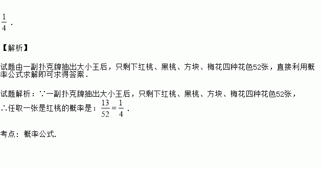 一副扑克牌抽出大小王后,只剩下红桃、黑桃、方块、梅花四种花色52张,则任取一张是红桃的概率是_________。