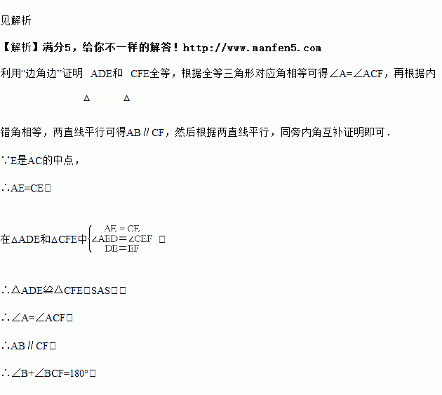 如图所示,点D是△ABC的边AB上一点,E是AC的中点,F是DE延长线上的一点,且DE=EF,连接CF,求证:∠B+∠BCF=180°.