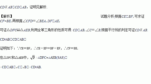 如图,点C,F,E,B在一条直线上,∠CFD=∠BEA,CE=BF,DF=AE,写出CD与AB之间的关系,并证明你的结论.