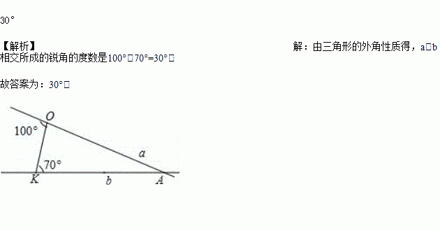 如图,平面上直线a,b分别经过线段OK两端点(数据如图),则a,b相交所成的锐角是_____.