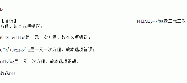 D 【解析】解:A.y= x2﹣3是二元二次方程,故本选项错误; B.2(x+1)=3是一元一次方程,故本选项错误; C.x2+3x﹣1=x2+1是一元一次方程,故本选项错误; D.x2=2是一元二次方程,故本选项正确. 故选D.