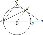 分析:(1)连接OE,由OA=OE,利用等边对等角得到一对角相等,再由AE为角平分线,利用角平分线定义得到一对角相等,等量代换得到一对内错角相等,利用内错角相等两直线平行得到AC与OE平行,利用两直线平行同位角相等得到∠OEB=∠C,都为直角,可得出BC垂直于OE,即可得到BC与圆O相切;