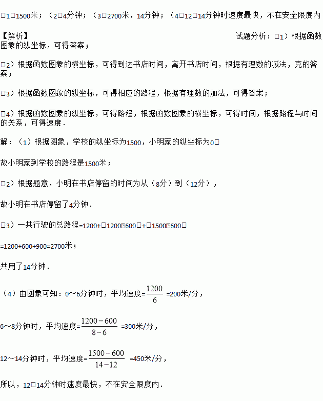 (1)1500米;(2)4分钟;(3)2700米,14分钟;(4)12~14分钟时速度最快,不在安全限度内 【解析】试题分析:(1)根据函数图象的纵坐标,可得答案; (2)根据函数图象的横坐标,可得到达书店时间,离开书店时间,根据有理数的减法,克的答案; (3)根据函数图象的纵坐标,可得相应的路程,根据有理数的加法,可得答案; (4)根据函数图象的纵坐标,可得路程,根据函数...