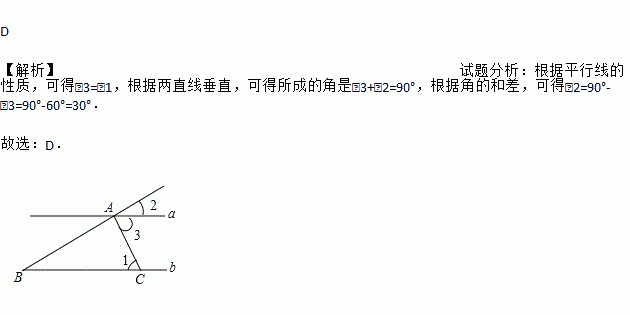 如图,直线a∥b,AC⊥AB,AC交直线b于点C,∠1=60°,则∠2的度数是( )