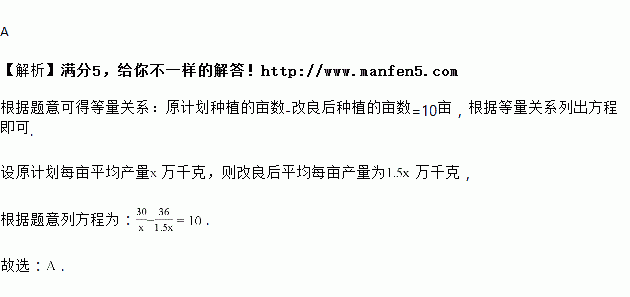 衡阳市某生态示范园计划种植一批梨树,原计划总产值30万千克,为了满足市场需求,现决定改良梨树品种,改良后平均每亩产量是原来的1.5倍,总产量比原计划增加了6万千克,种植亩数减少了10亩,则原来平均每亩产量是多少万千克?设原来平均每亩产量为x万千克,根据题意,列方程为( )