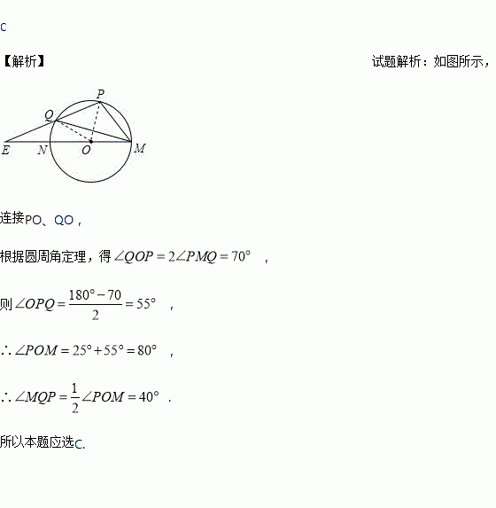 如图,MN是⊙O的直径,若∠E=25°,∠PMQ=35°,则∠MQP=( )