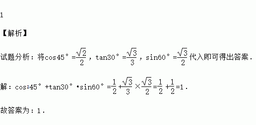 计算:cos245°+tan30°•sin60°= .