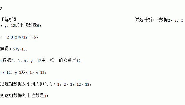 一组数据2,3,x,y,12中,唯一的众数是12,平均数是6,这组数据的中位数是____.