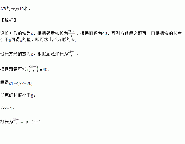 如图,要建一个面积为40平方米的矩形花园ABCD,为了节约材料,花园的一边AD靠着原有的一面墙,墙长为8米(AD<8),另三边用栅栏围成,已知栅栏总长为24米,求花园一边AB的长.