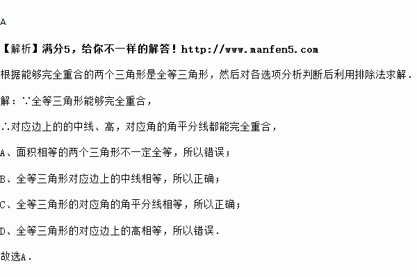 A. 面积相等的两个三角形全等 B. 全等三角形对应边上的中线相等