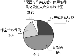 (2)图2中,使用收费塑料购物袋的人数所占百分比为25%.