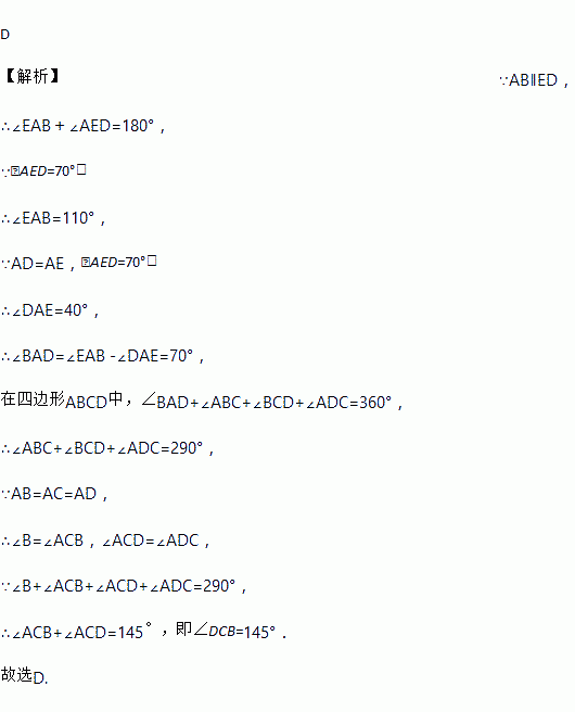 如图,在五边形ABCDE中,AB=AC=AD=AE, 且AB∥ED,∠AED=70°,则∠DCB=( )