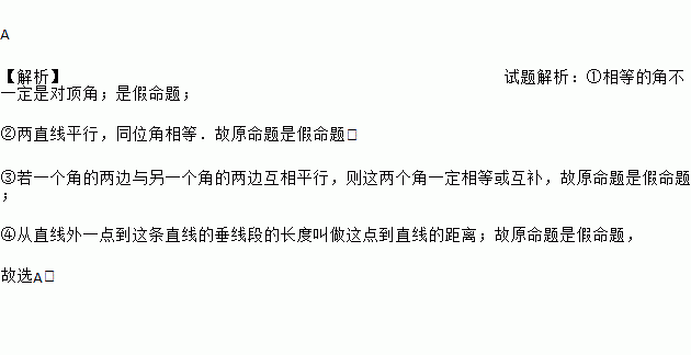 A 【解析】试题解析:①相等的角不一定是对顶角;是假命题; ②两直线平行,同位角相等.故原命题是假命题; ③若一个角的两边与另一个角的两边互相平行,则这两个角一定相等或互补,故原命题是假命题; ④从直线外一点到这条直线的垂线段的长度叫做这点到直线的距离;故原命题是假命题, 故选A.