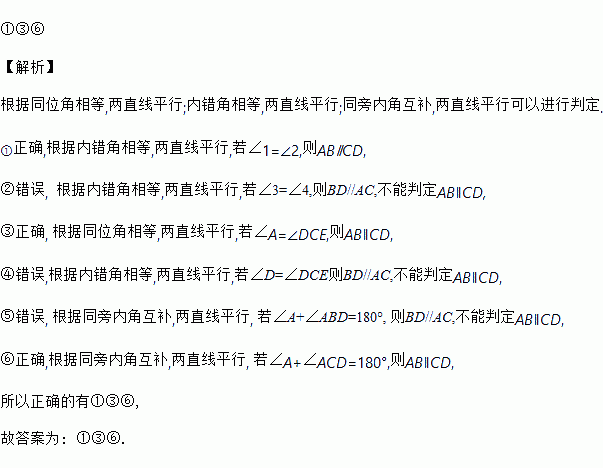 如图所示,点E在AC的延长线上,有下列条件∠1=∠2,②∠3=∠4,③∠A=∠DCE,④∠D=∠DCE,⑤∠A+∠ABD=180°,⑥∠A+∠ACD=180°,其中能判断AB∥CD的是_____.