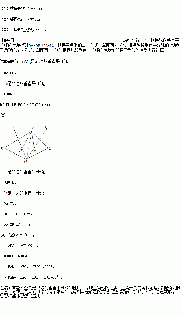 如图,在△ABC中,AB边的垂直平分线l1交BC于点D,AC边的垂直平分线l2交BC于点E,l1与l2相交于点O,连接0B,OC,若△ADE的周长为6cm,△OBC的周长为16cm.