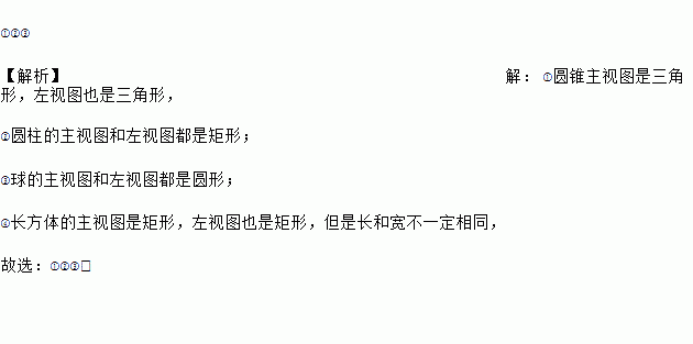 如图,在常见的几何体圆锥、圆柱、球、长方体中,主视图与它的左视图一定完全相同的几何体有_________