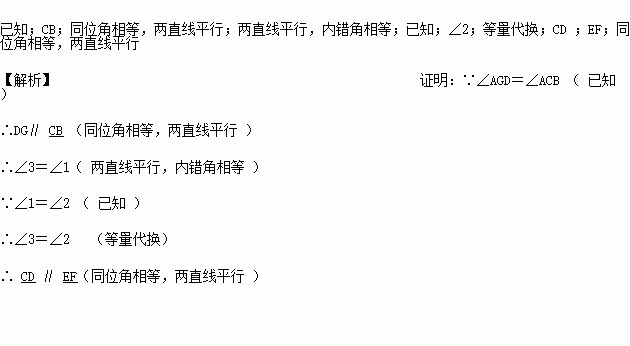 如图,已知∠AGD=∠ACB,∠1=∠2。求证:CD∥EF。(填空并在后面的括号中填理由)