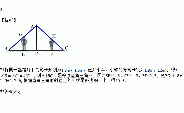 如图,小军、小珠之间的距离为2.7m,他们在同一盏路灯下的影长分别为1.8m,1.5m,已知小军、小珠的身高分别为1.8m,1.5m,则路灯的高为 m.