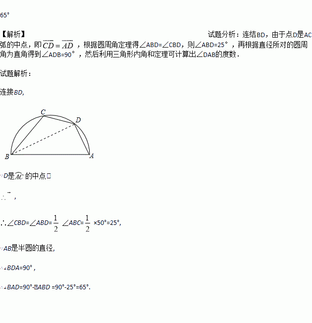 如图,AB是半圆的直径,点D是的中点,∠ABC=50°,求∠BAD的度数.