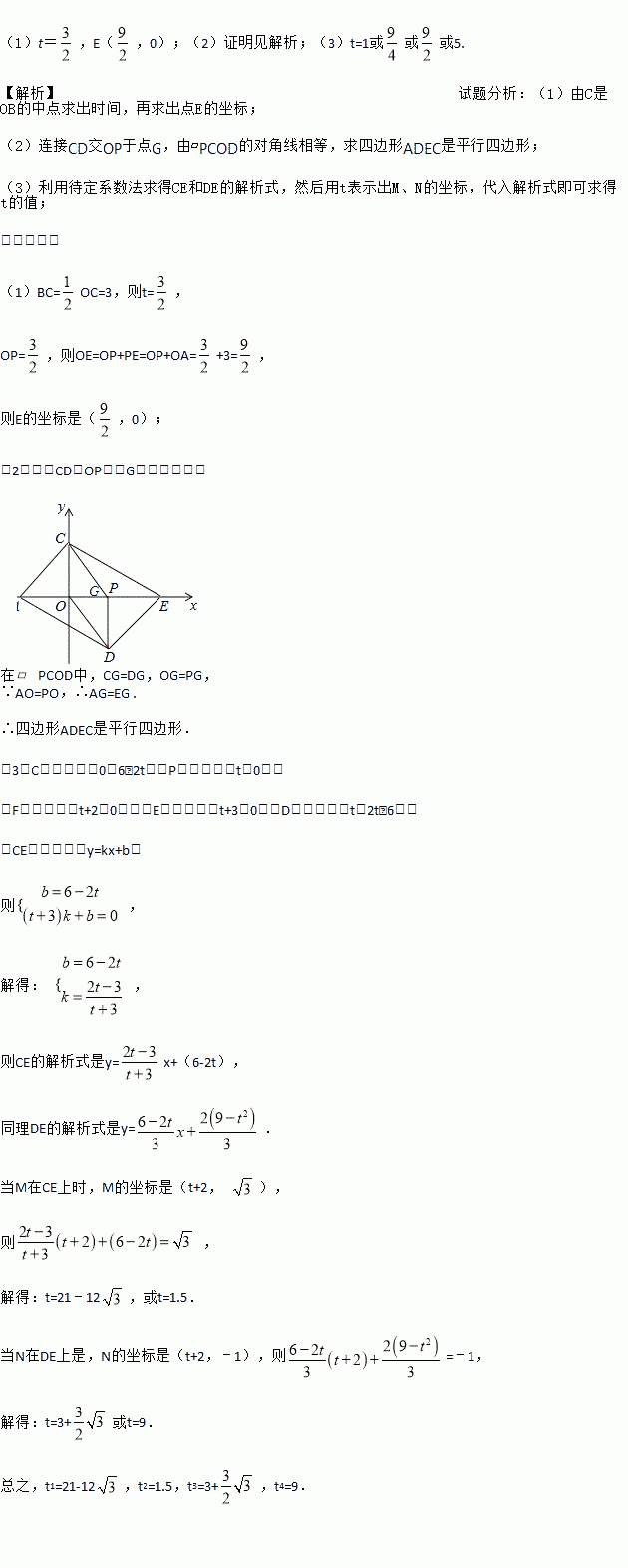 如图,在平面直角坐标系中,点A,B的坐标分别为(-3,0),(0,6).动点P从点O出发,沿x轴正方向以每秒1个单位的速度运动,同时动点C从点B出发,沿射线BO方向以每秒2个单位的速度运动,以CP,CO为邻边构造?PCOD,在线段OP延长线上取点E,使PE=AO,设点P运动的时间为t秒.