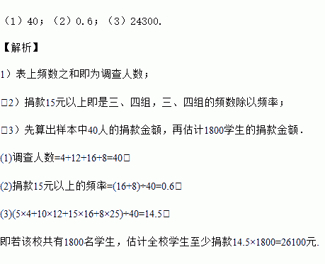 (3)若该校共有1800名学生,估计全校学生一共捐款至少多少元?