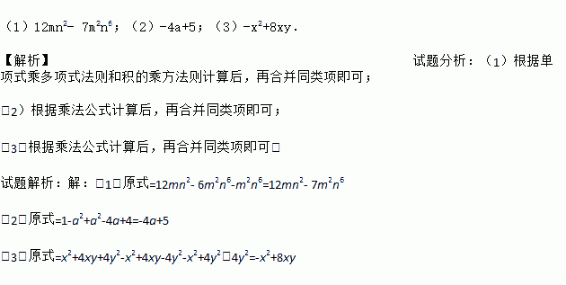 (1)12mn2- 7m2n6;(2)-4a+5;(3)-x2+8xy. 【解析】试题分析:(1)根据单项式乘多项式法则和积的乘方法则计算后,再合并同类项即可; (2)根据乘法公式计算后,再合并同类项即可; (3)根据乘法公式计算后,再合并同类项即可. 试题解析:【解析】 (1)原式=12mn2- 6m2n6-m2n6=12mn2- 7m2n6 (2)原式=1-a2...