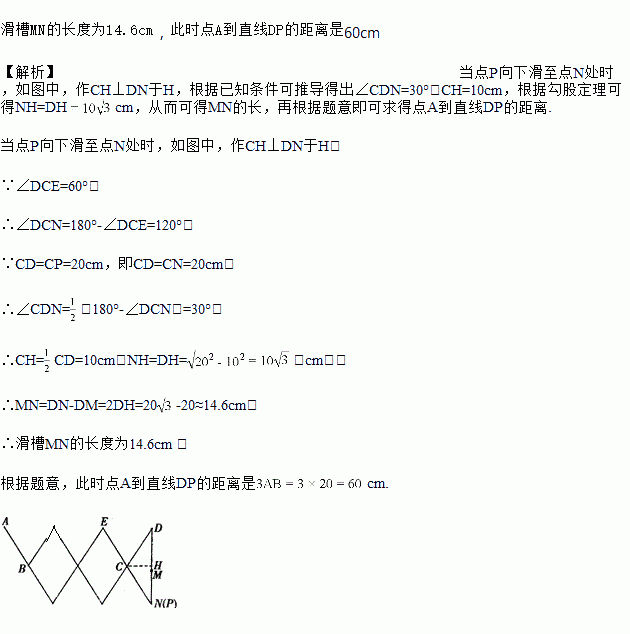 如图(1)是一个晾衣架的实物图,支架的基本图形是菱形,MN是晾衣架的一个滑槽,点P在滑槽MN上、下移动时,晾衣架可以伸缩,其示意图如图(2)所示,已知每个菱形的边长均为20cm,且AB=CD=CP=DM=20cm.当点P向下滑至点N处时,测得∠DCE=60°时,求滑槽MN的长度和此时点A到直线DP的距离(精确到0.01cm,参考数据