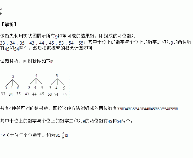 一个不透明的袋子中装有三个完全相同的小球,分别标有数字3、4、5.从袋子中随机取出一个小球,用小球上的数字作为十位上的数字,然后放回;再取出一个小球,用小球上的数字作为个位上的数字,这样组成一个两位数.试问:按这种方法能组成哪些两位数?十位上的数字与个位上的数字之和为9的两位数的概率是多少?用列表法或画树状图法加以说明.