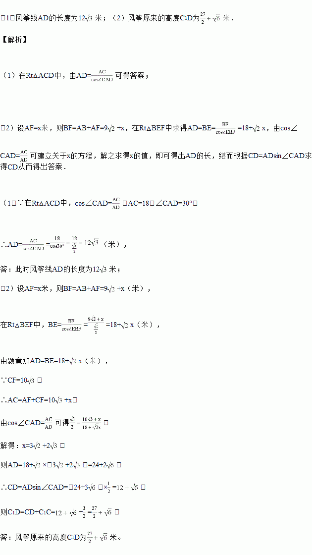 (1)当风筝的水平距离AC=18米时,求此时风筝线AD的长度;