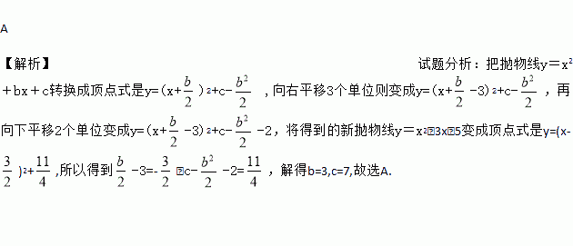 A 【解析】试题分析:把抛物线y=x2+bx+c转换成顶点式是y=(x+)2+c- ,向右平移3个单位则变成y=(x+-3)2+c-,再向下平移2个单位变成y=(x+-3)2+c--2,将得到的新抛物线y=x2-3x+5变成顶点式是y=(x-)2+,所以得到-3=-,c--2=,解得b=3,c=7,故选A.