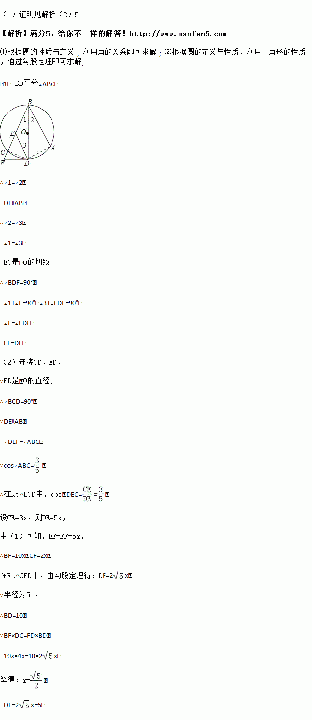 如图,A,B,C三点在⊙O上,直径BD平分∠ABC,过点D作DE∥AB交弦BC于点E,过点D作⊙O的切线交BC的延长线于点F.