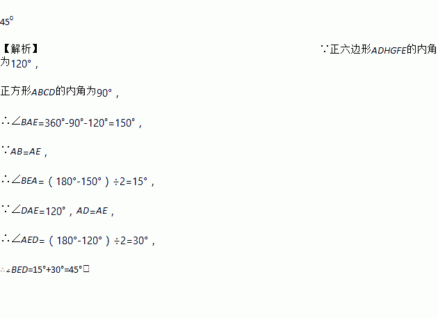 如图,以正六边形ADHGFE的一边AD为边向外作正方形ABCD,则∠BED=_______°.