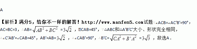 如图,将两个大小、形状完全相同的△ABC和△A′B′C′拼在一起,其中点A′与点A重合,点C′落在边AB上,连接B′C.若∠ACB=∠AC′B′=90°,AC=BC=3,则B′C的长为( )