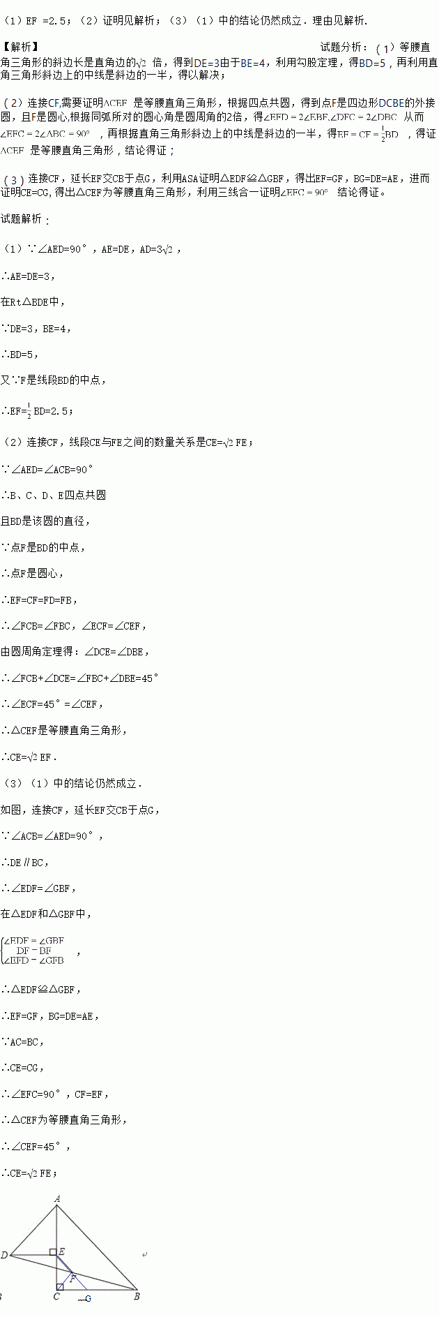 (3)将图1中的△AED绕点A顺时针旋转,使AED的一边AE恰好与△ACB的边AC在同一条直线上(如图2),连接BD,取BD的中点F,问(2)中的结论是否仍然成立,并说明理由.