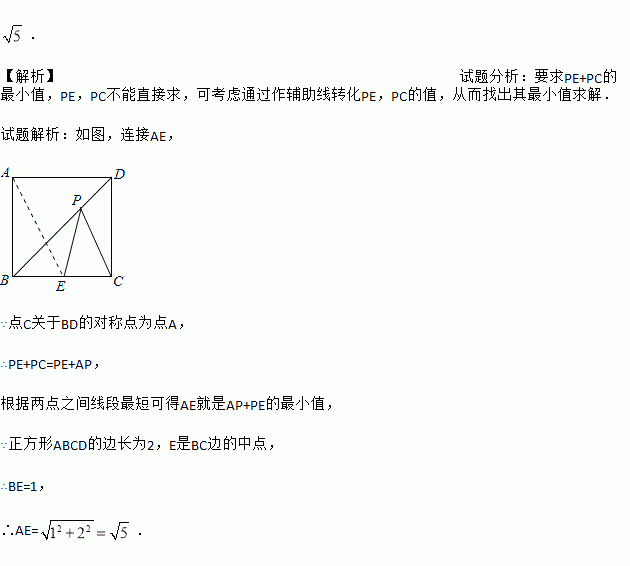 如图,正方形ABCD的边长为2,点E为边BC的中点,点P在对角线BD上移动,则PE+PC的最小值是 .