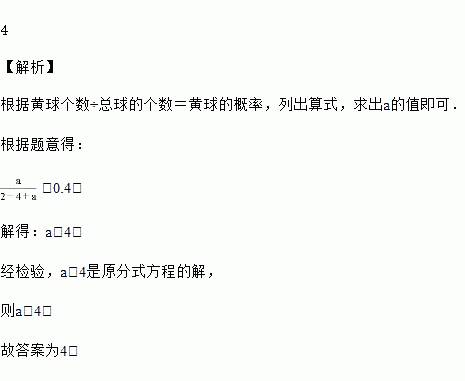 一个不透明的布袋里装有2个红球,4个白球和a个黄球,这些球除颜色外其余都相同,若从该布袋里任意摸出1个球是黄球的概率为0.4,则a=_____.