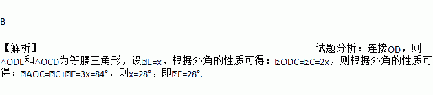 B 【解析】试题分析:连接OD,则△ODE和△OCD为等腰三角形,设∠E=x,根据外角的性质可得:∠ODC=∠C=2x,则根据外角的性质可得:∠AOC=∠C+∠E=3x=84°,则x=28°,即∠E=28°.