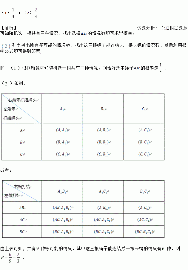 三个绳头中随机选两个打一个结,求这三根绳子能连结成一根长绳的概率.