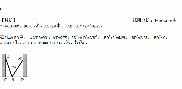 C 【解析】试题分析:在Rt△ACB中,∵∠ACB=90°,BC=0.7米,AC=2.4米,∴AB2=0.72+2.42=6.25. 在Rt△A′BD中,∵∠A′DB=90°,A′D=2米,BD2+A′D2=A′B′2,∴BD2+22=6.25,∴BD2=2.25,∵BD>0,∴BD=1.5米,∴CD=BC+BD=0.7+1.5=2.2米.故选C.