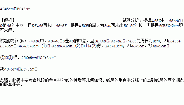 如图,在△ABC中,AB=AC,D是AB的中点,且DE⊥AB,△BCE的周长为8cm,且AC﹣BC=2cm,求AB、BC的长.
