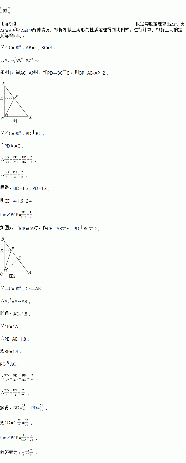 如图,在△ABC中,∠C=90°,AB=5,BC=4,点P在边AB上,若△APC为以AC为腰的等腰三角形,则tan∠BCP=________.