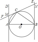 如图,已知AB为⊙O的直径,AB=2,AD和BE是圆O的两条切线,A、B为切点,过圆上一点C作⊙O的切线CF,分别交AD、BE于点M、N,连接AC、CB,若∠ABC=30°,则AM= .