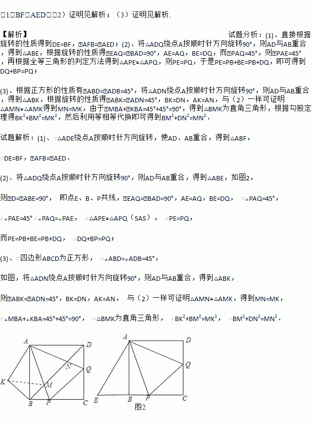 (2)如图2,正方形ABCD中,P、Q分别是BC、CD边上的点,且∠PAQ=45°,试通过旋转的方式说明:DQ+BP=PQ;