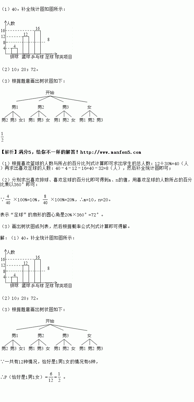 (2)扇形统计图中m= ,n= ,表示“足球”的扇形的圆心角是 度;